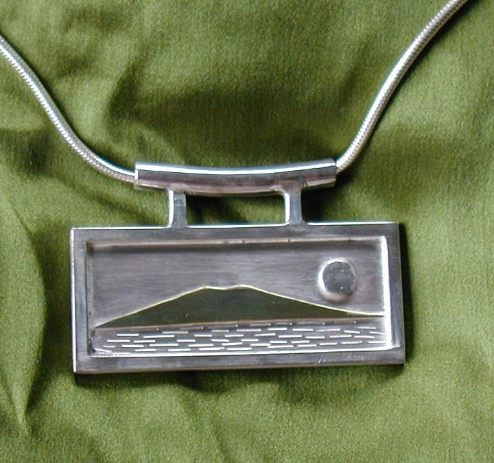 The Rangitoto series features landscapes of Rangitoto island in gold, in a rectangular sterling silver frame with a variety of moods and finishes.