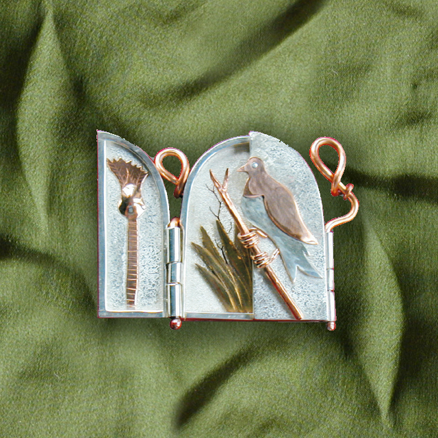 The kereru triptych is an archway locket with a kereru seated on a branch on the front. The branches form the door closure mechanism. Inside the central panel features a brass flax plant, with pierced flax flowers. The… Read More
