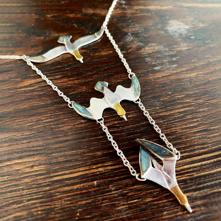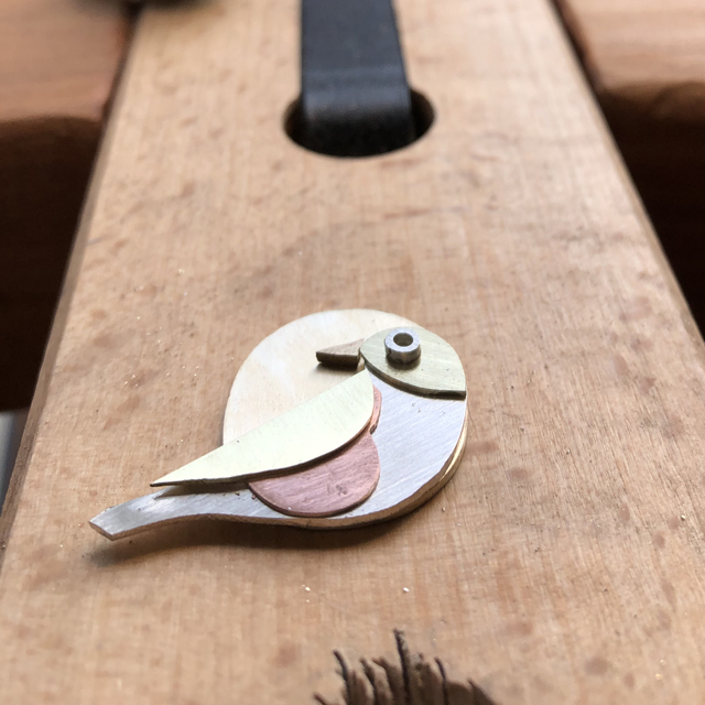 The silvereye pendant is a layered piece formed from silver, brass and copper.
