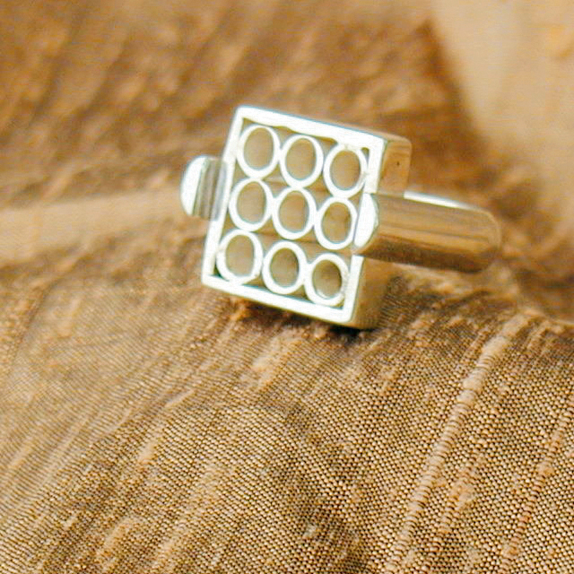 The face of this ring is formed by a grid of framed sterling silver tubing sections. The ring shank is half round sterling silver.