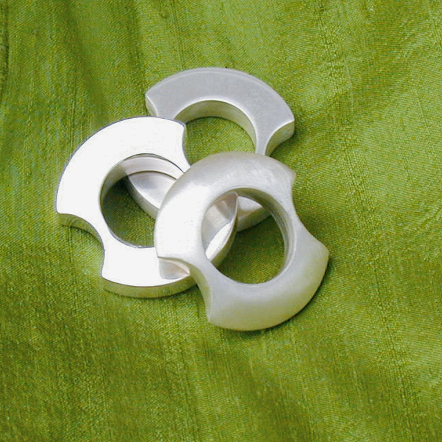 This piece is a one-of-a-kind casting in sterling silver mounted on brass chenier with a kinetic hollow-formed bead. Influenced by British modernists and their monolithic depictions of family, it explores the idea of children leaving the family nest… Read More