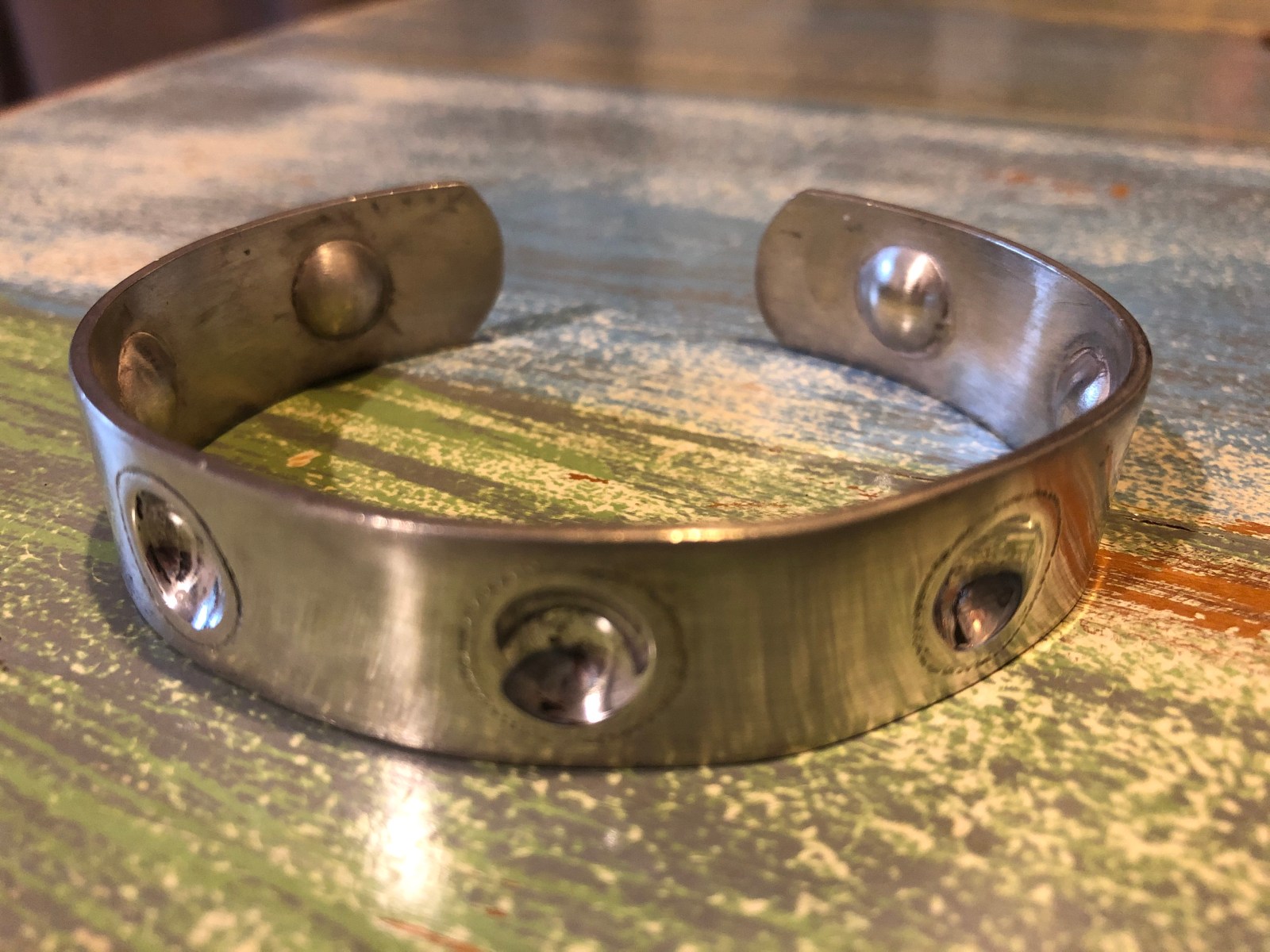 Sterling silver bangle with concave dome motif.