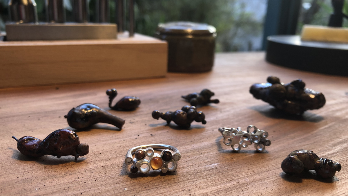 These mineral deposits, which can occur in nature when lightning strikes the ground, and often take on tube shaped forms, and are known as fulgurites. I was quite taken with the forms themselves, some of which looked like alien creatures, or clusters of bubbles, but was also interested in incorporating the glass-like material into some jewellery, along with the melted copper electrical wires.