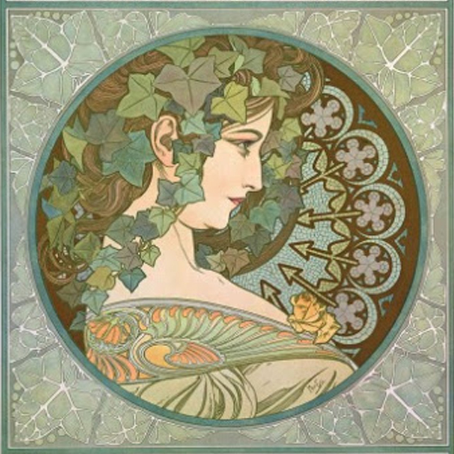 I’m certainly not the first jeweller to think this, there is a long history of foliage as a motif in jewellery and decorative arts. From the Alphonse Mucha’s Ivy panel, where the ivy forms a border and cascades through the model’s hair, to decorative wallpapers, friezes and stained glass. Ivy was used to symbolise eternal life, and fidelity because it is evergreen and clings to its host, but was also associated with Dionysus/Bacchus and vigour.