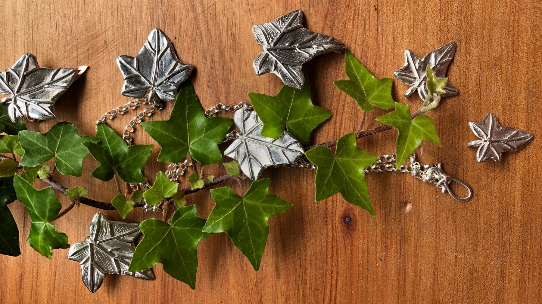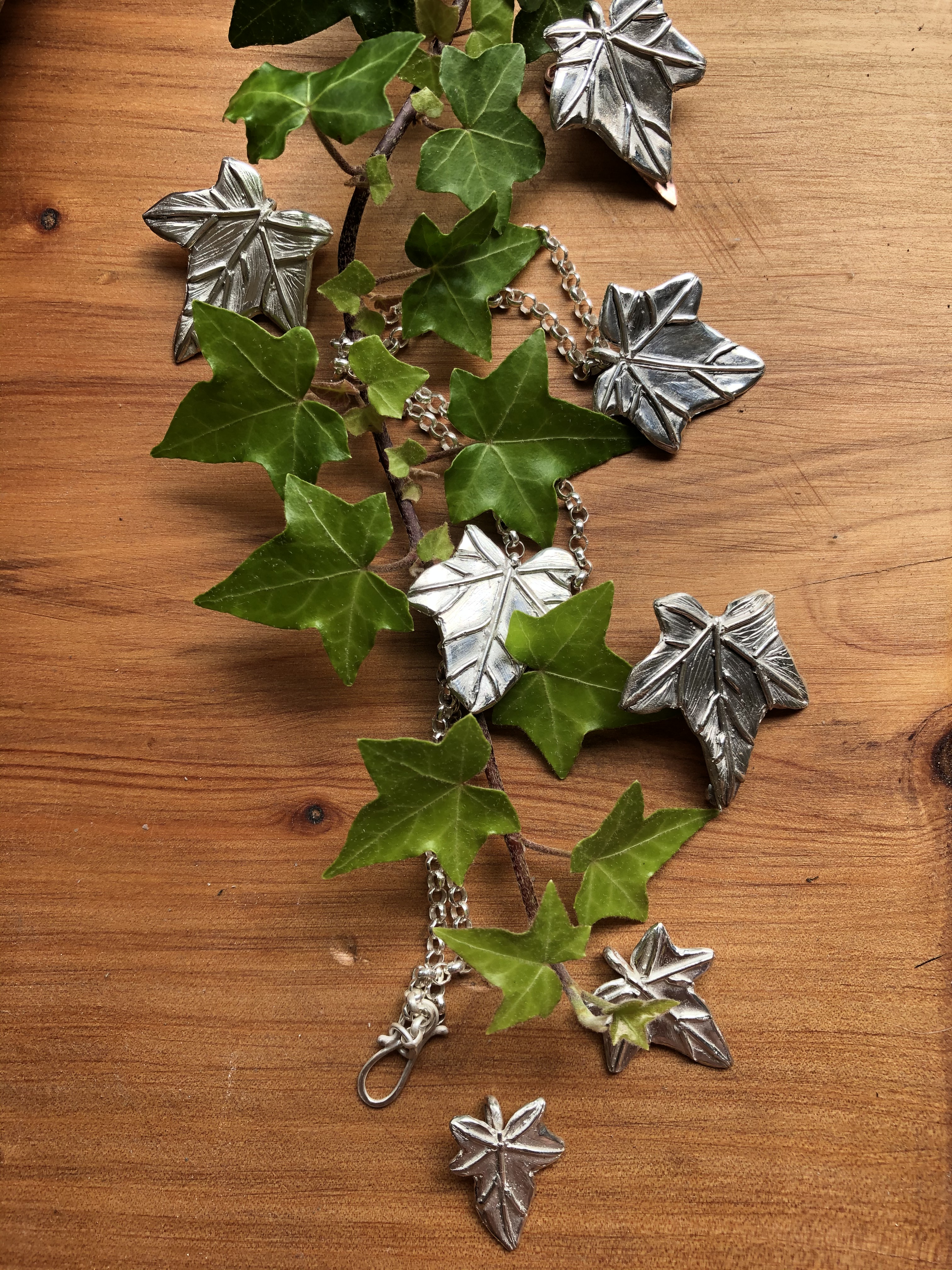 The leaves I’ve created were first formed in wax, then cast in sterling silver. I’m now developing them into a set of pieces, from single leaf pendants and brooches, to twining chokers featuring cascading foliage.