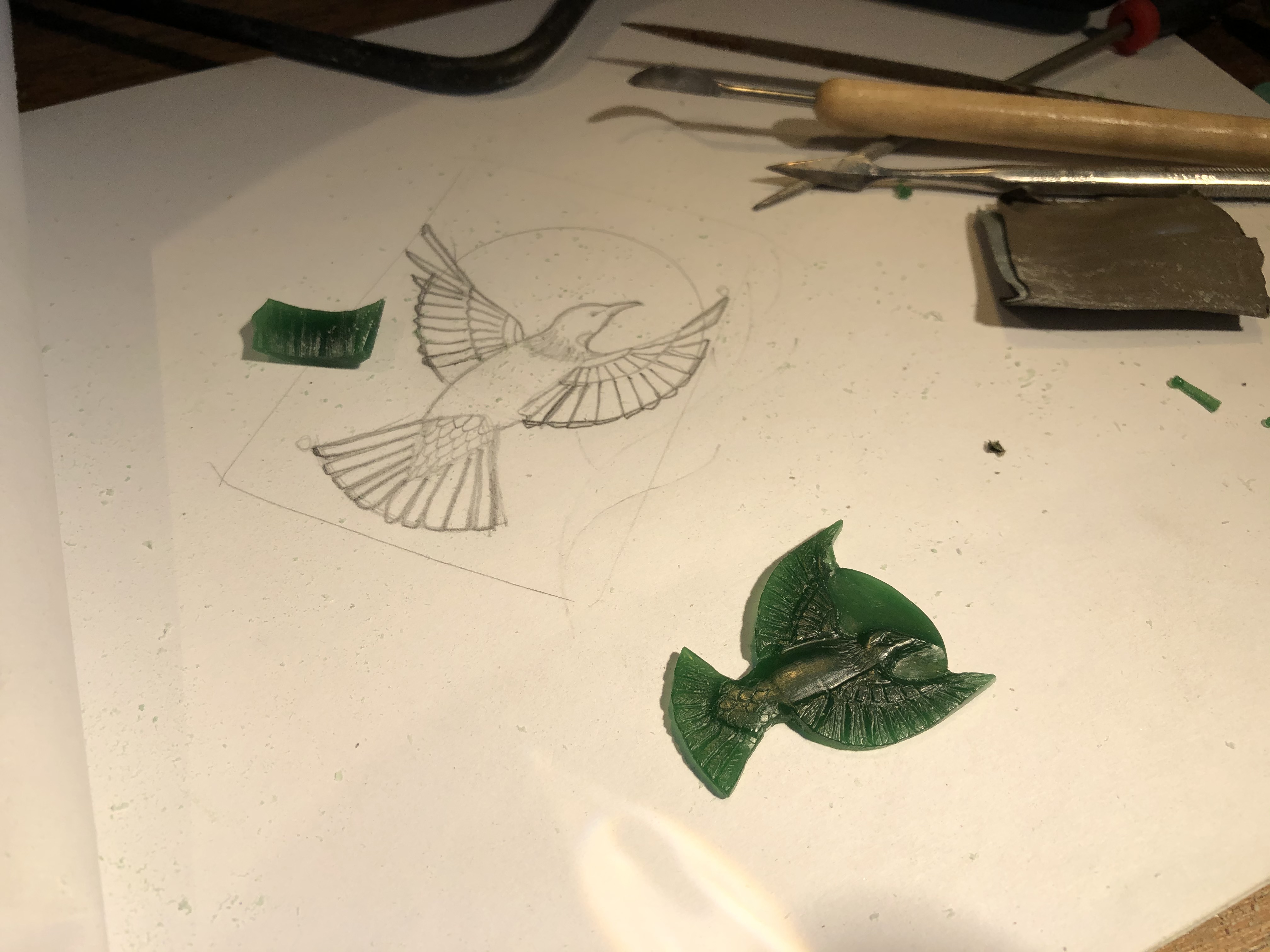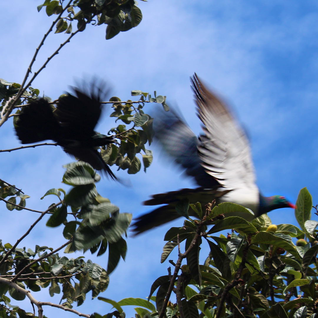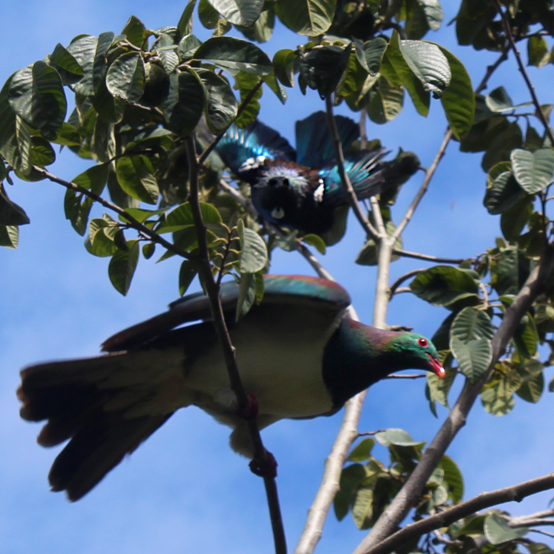 These pieces were inspired by a territorial battle between a kereru and a tui in the garden outside my studio. With fruit ripening on the cherimoya and loquat trees, the local birds were spending a lot of time here. The kereru was a regular visitor, and wasn’t easily shifted from her favourite spot guarding the fruit, but this tui issued a challenge, ruffling his feathers, intimidating the kereru with thrusts of his head, and dive bombing her until she reluctantly gave up her claim.