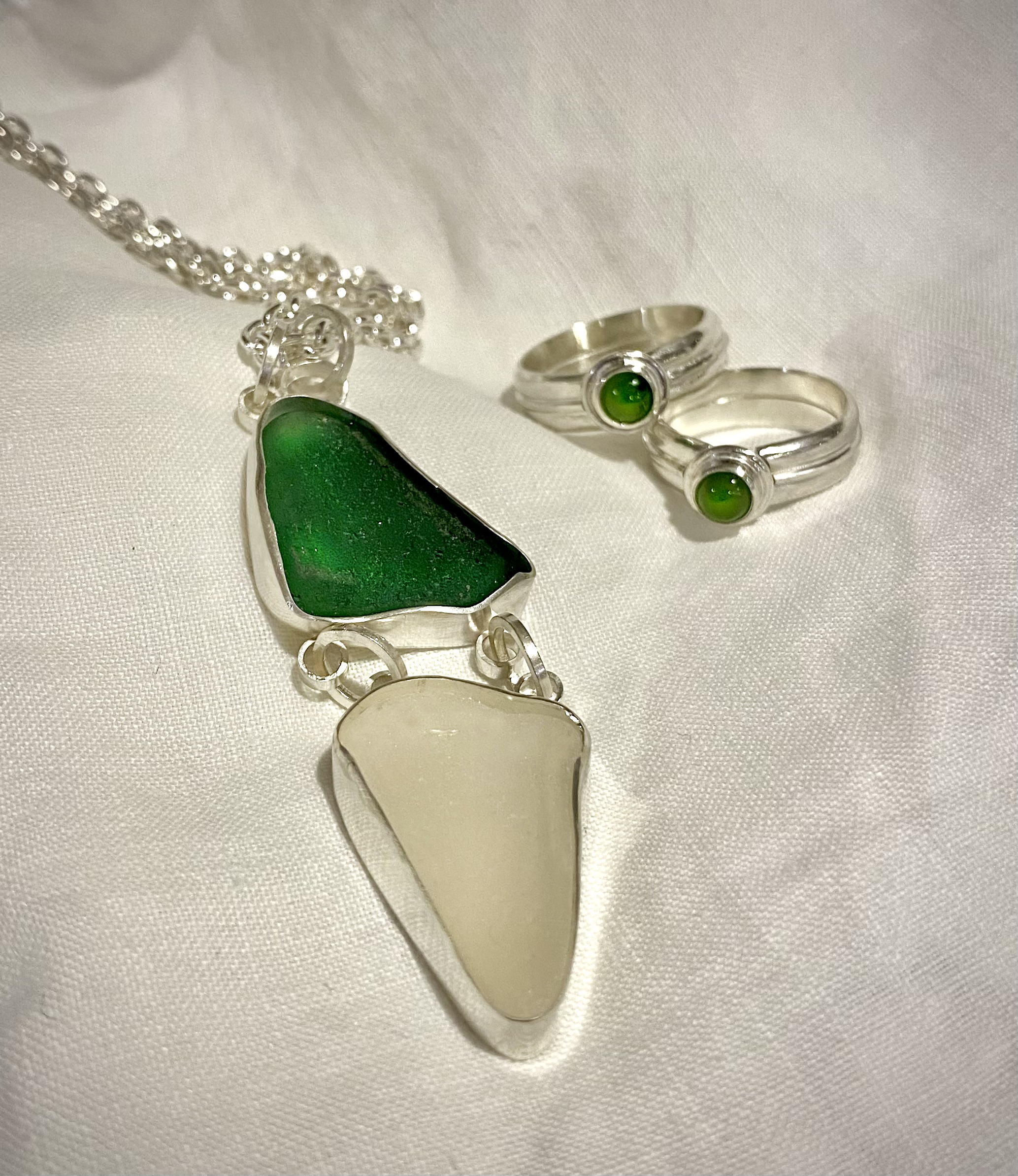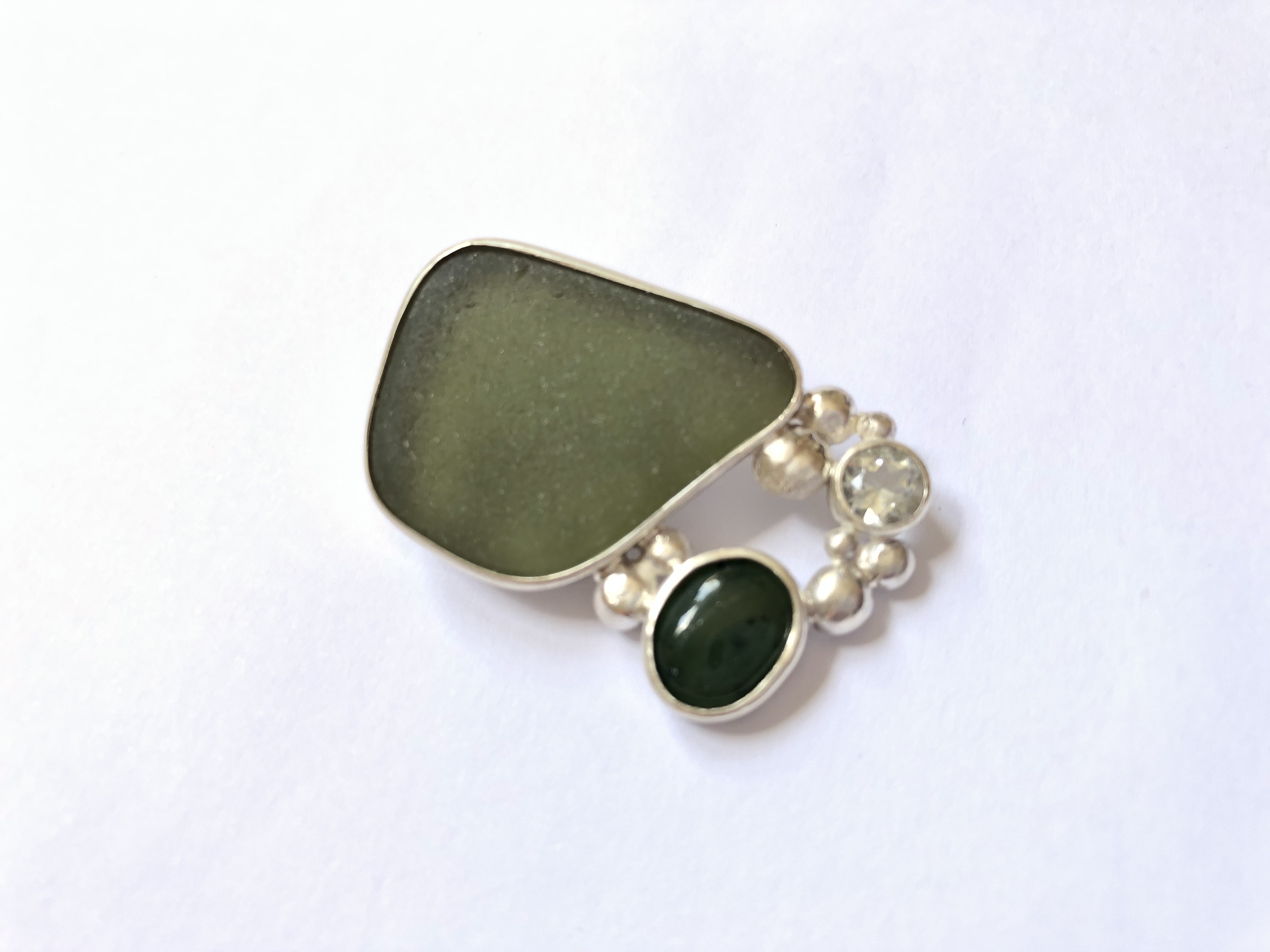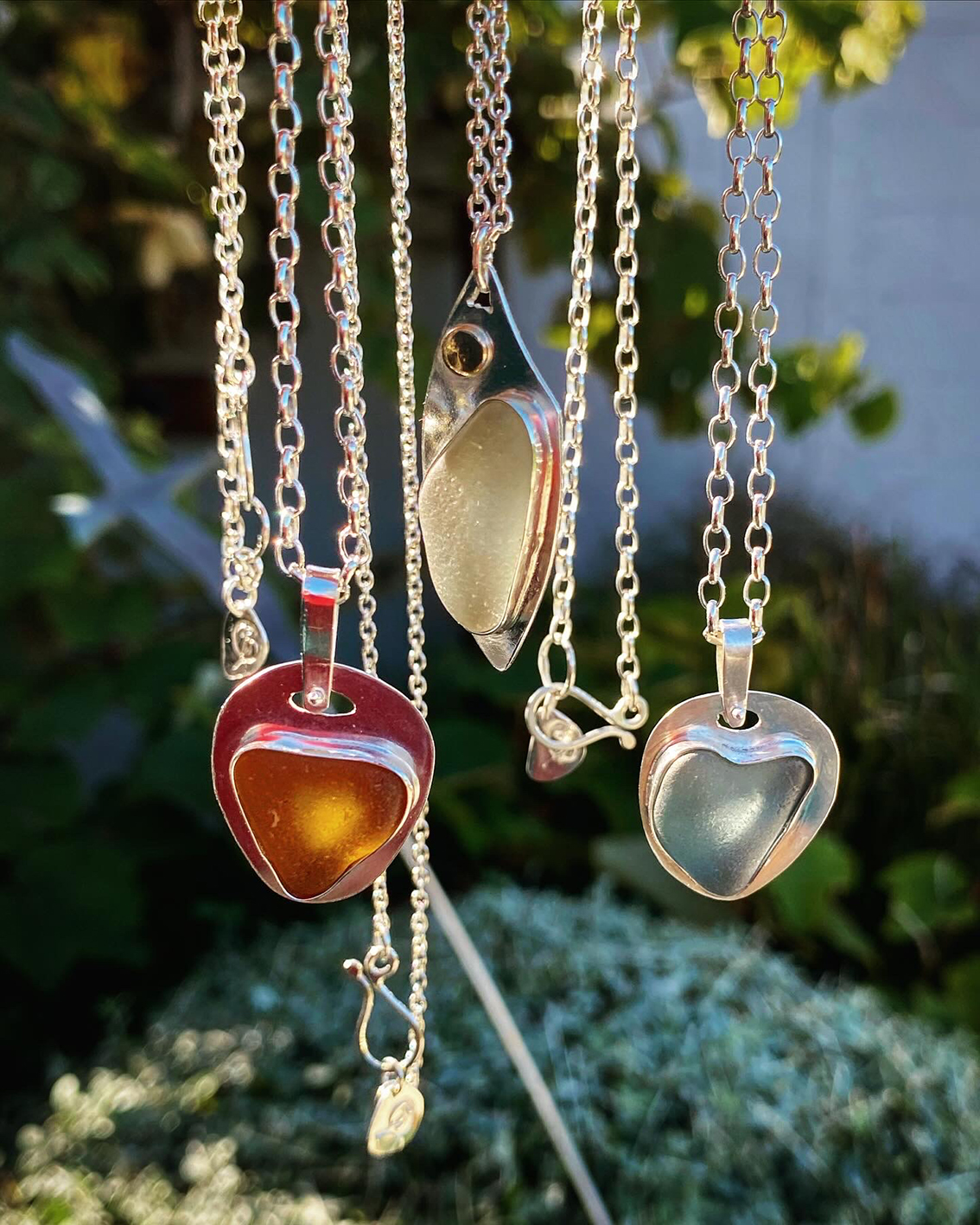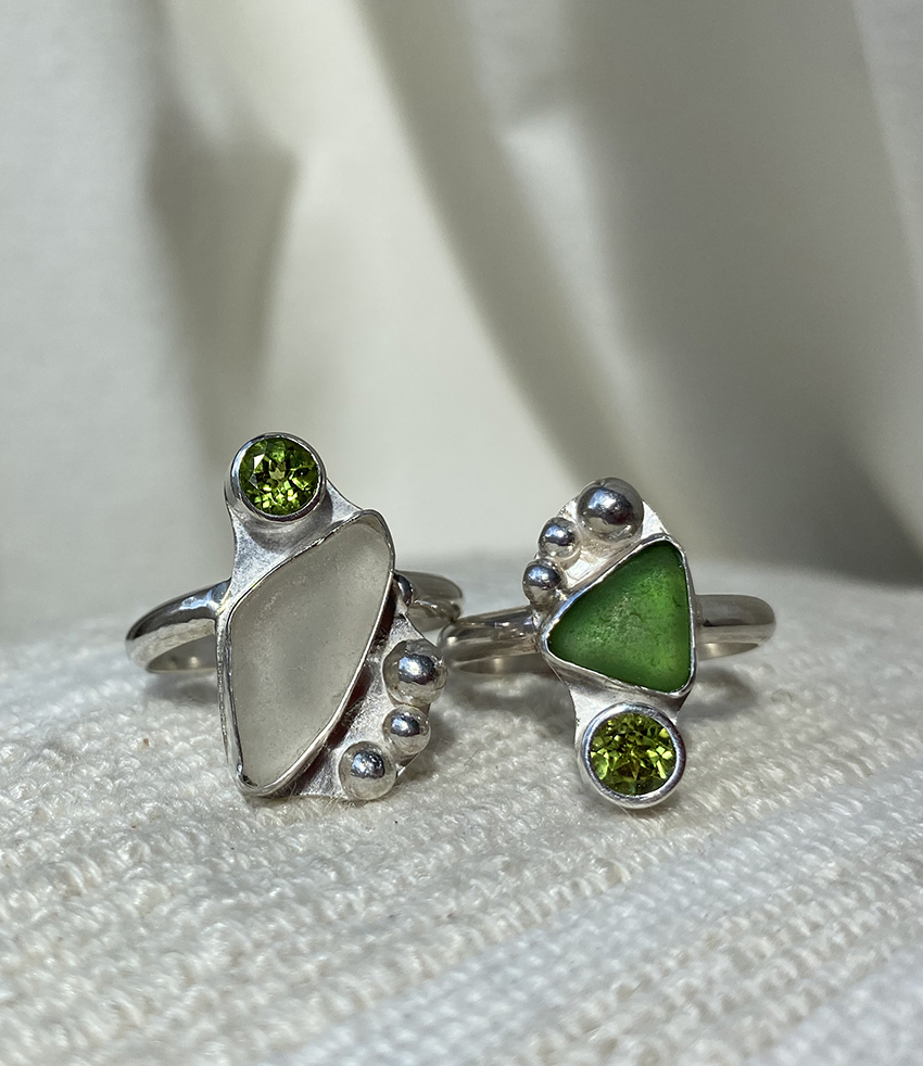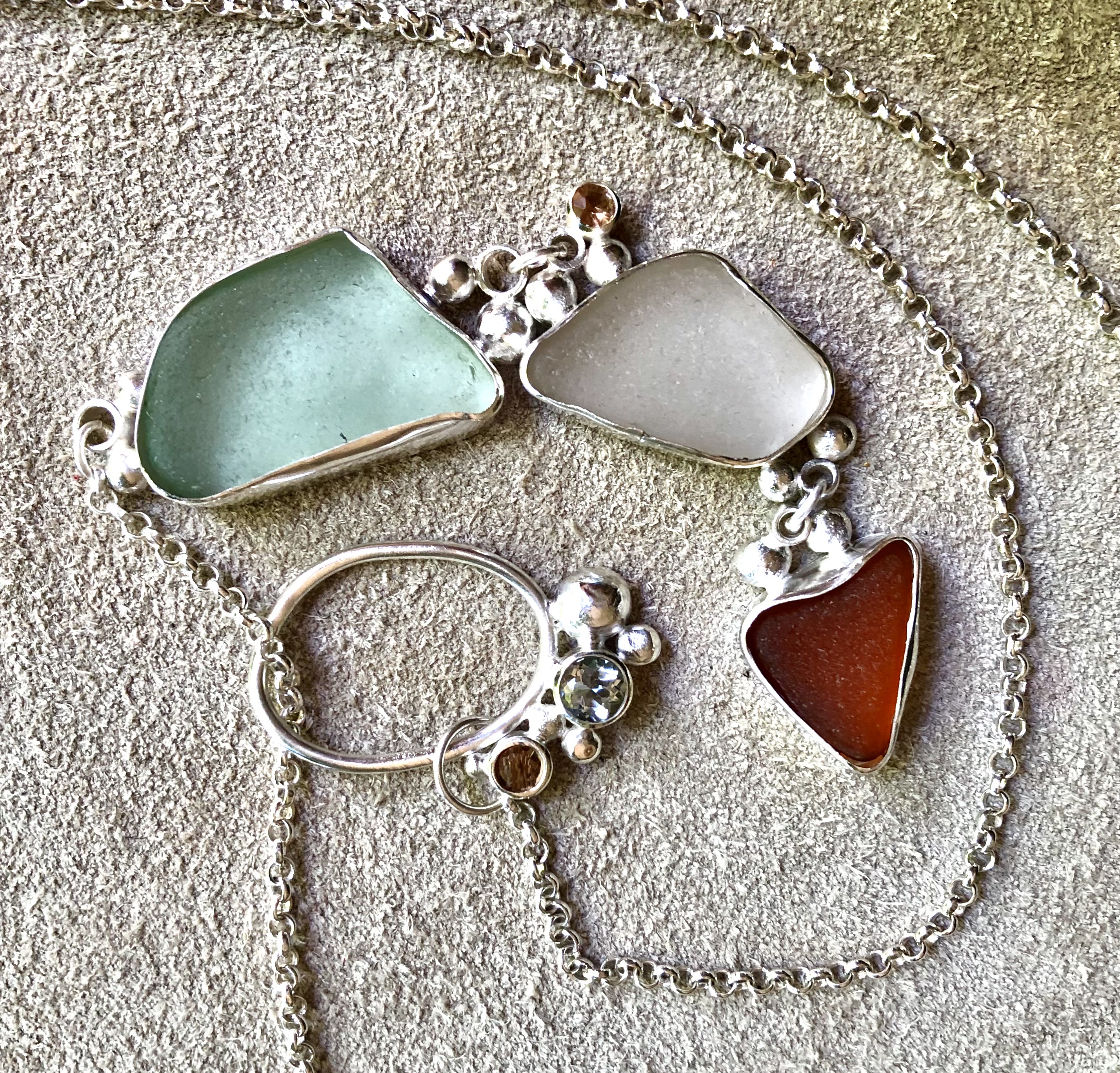 I’m fortunate to live on Waiheke Island, so walks on the beach are a regular part of my daily routine. Amongst the pebbles and shells I often find pieces of seaglass, weathered and worn by the ocean over time into smooth organic shapes. Many of these pieces of glass are just crying out to be made wearable, and I’ve been combining them with silver and precious and semi-precious stones. I love taking something that was waste, and giving it a new lease on life as something beautiful and desirable.