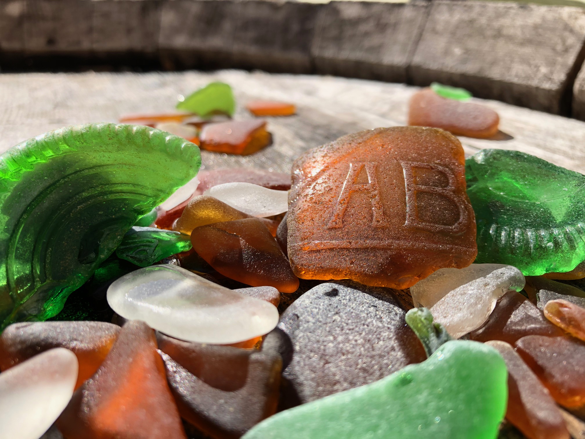 Finding seaglass also makes us aware of our relationship to resources. One of my most fascinating finds recently was a bottle fragment with the letters AB on it. Further research at Te Papa’s website revealed this to be from a bottle belonging to the Associated Bottlers Co Ltd (formerly the Auckland Bottle Co Ltd). Bottles created during the late 19th and early 20th century in New Zealand were a valuable resource, and as such, the ownership of the bottles was retained by the bottling company. Bottles were imprinted with the words “THIS BOTTLE IS THE PROPERTY OF THE ASSOCIATED BOTTLERS CO LTD NZ”, and regular newspaper advertisements reminded people that bottles had to be returned to the company. Those found to be hoarding the bottles were also publicly shamed by newspaper advertising. I’ve since found several more of these pieces, including part of the proprietary statement.