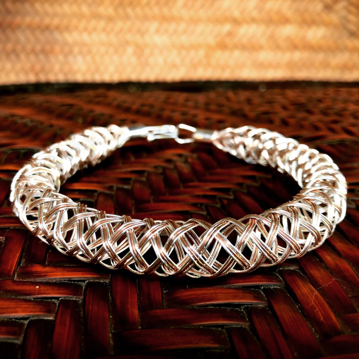 Sterling silver and copper bracelet created using traditional Japanese kumihimo “gathered threads” techniques to braid 0.5mm silver and copper wire into a rigid hollow tube.