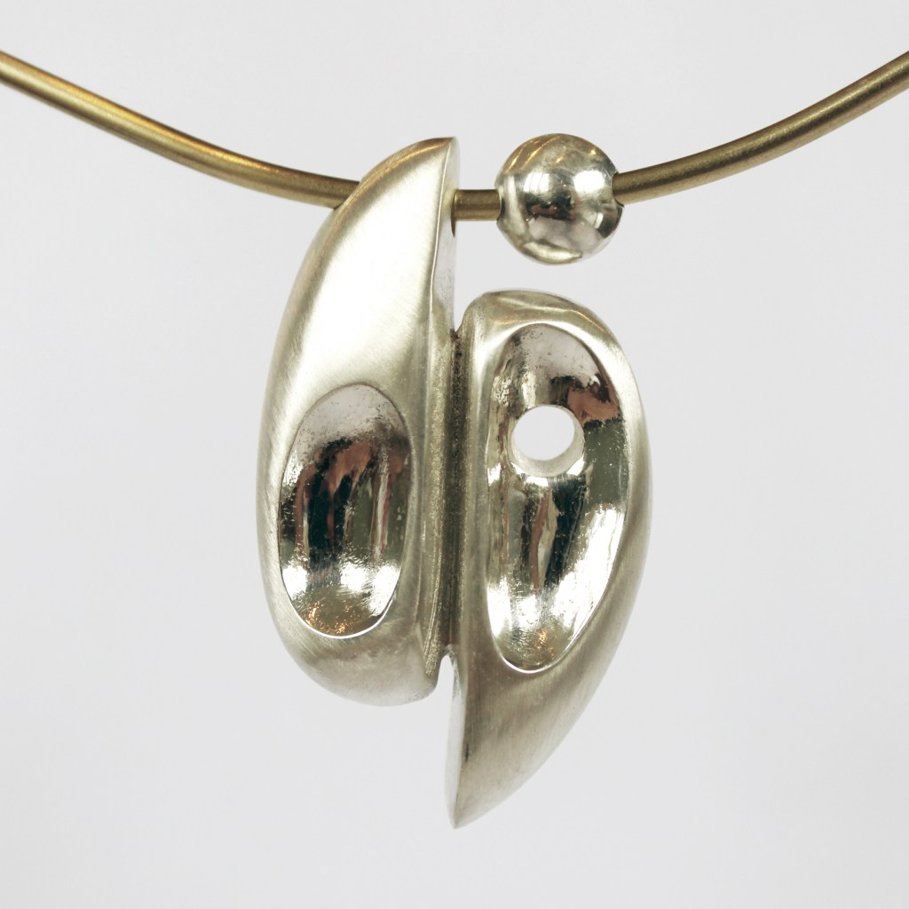 This piece is a one-of-a-kind casting in sterling silver mounted on brass chenier with a kinetic hollow-formed bead. Influenced by British modernists and their monolithic depictions of family, it explores the idea of children leaving the family nest and striking out on their own. This piece was a finalist in the 2021 Small Sculpture Prize.
