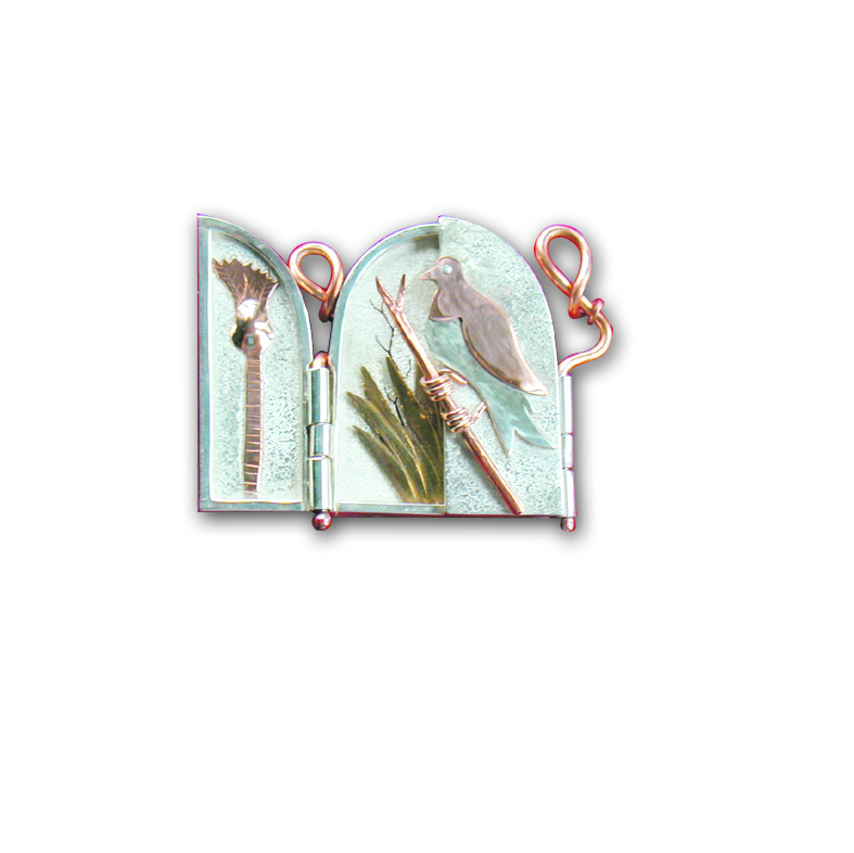 The silvereye pendant is a layered piece formed from silver, brass and copper.