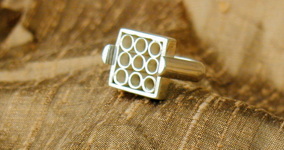 The face of this ring is formed by a grid of framed sterling silver tubing sections. The ring shank is half round sterling silver.